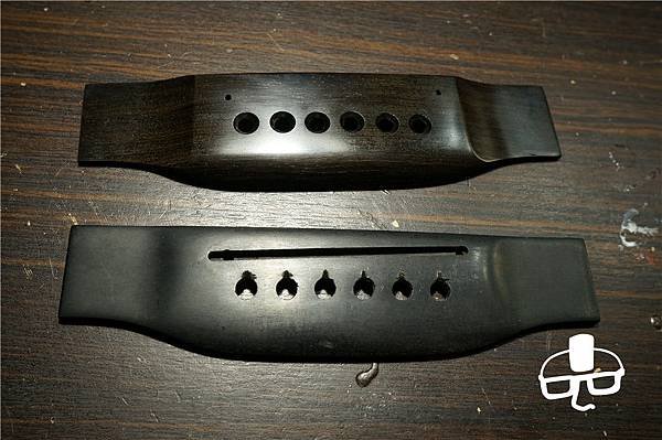 Martin復古形式的下枕比起標準型 不僅長度較長,兩緣也會跟著琴橋兩翼的形狀走 最重要的是,復古形的琴橋,下枕通常是黏死的 這會使得想要降低弦高變得很傷腦筋,無法輕易的拆下來打磨 且打磨底部後兩緣的形狀也會與琴橋兩翼有落差 使的外觀不美麗。 比較變通的解決方案通常是直接打磨下枕的頂部 但由於位置的限制除了修弧度時要很小心 要重新修出被磨掉的八度音角,操作空間也很有限 一個閃失就會敲到面板了,這可是把我媽賣掉也賠不起的!!