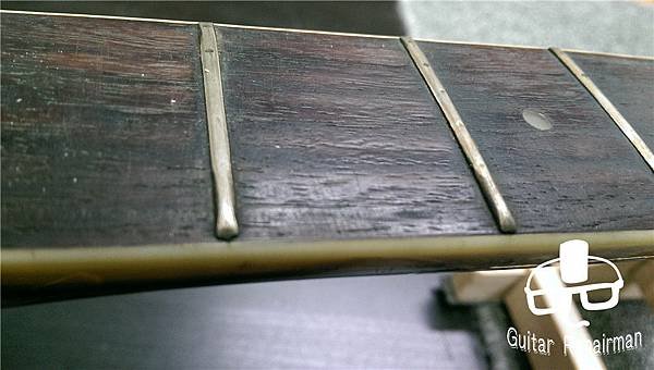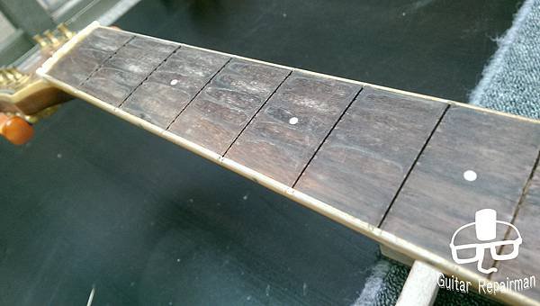 有關琴椼fret是一件比較精密的作業,影響最直接的就是手感、若處理的不夠精準會造成雜音(打弦) 這把琴也許是先天不良,或是保存不當等因素,琴主發現調整起來不太對勁,弦高低不下去還很容易打弦,所以初步判斷可能是指板也變型了,導致一般的調整無法改善,必須要高一層級的維修 結果fert拔了之後就放棄了@@ 所以在下第一次遇到沒有fret的吉他, 自然無需多講直接給他蕊芙淚下去啦! 指板留有不少污垢 Inlay沒有做切斷的動作 下枕槽相當的不平整 指板也是相當的不平整 了解一下原本的弧度