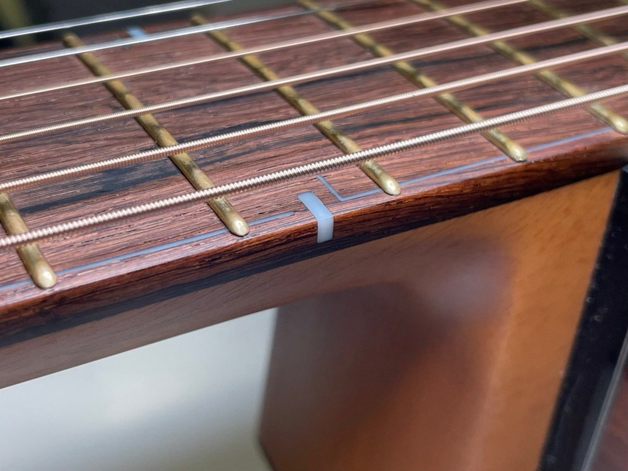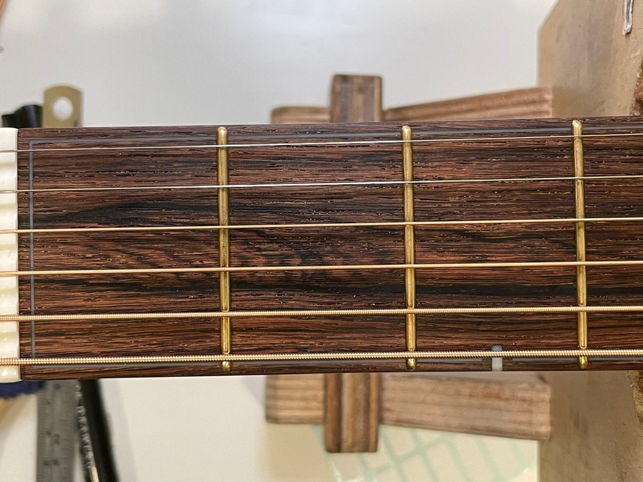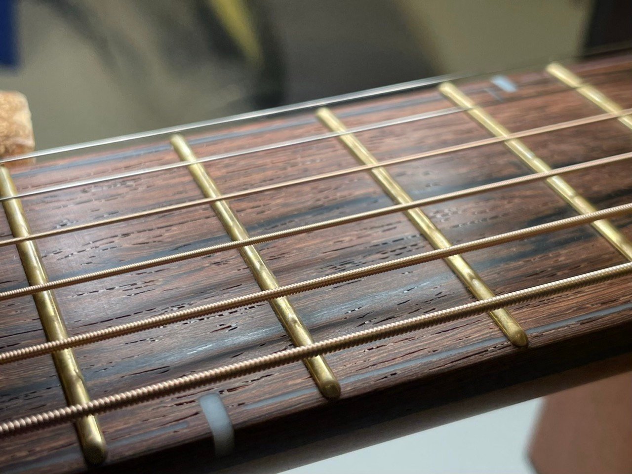 圓頭品絲常見,或者說必然的問題:每根fret的盡頭不一定切齊指板邊緣,這裡2, 3ft很明顯較短