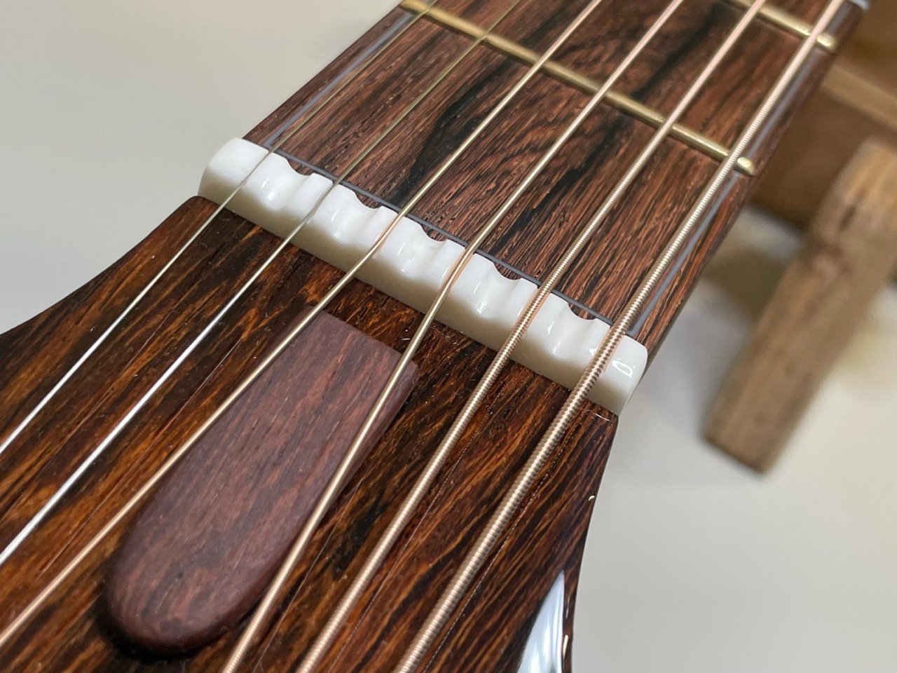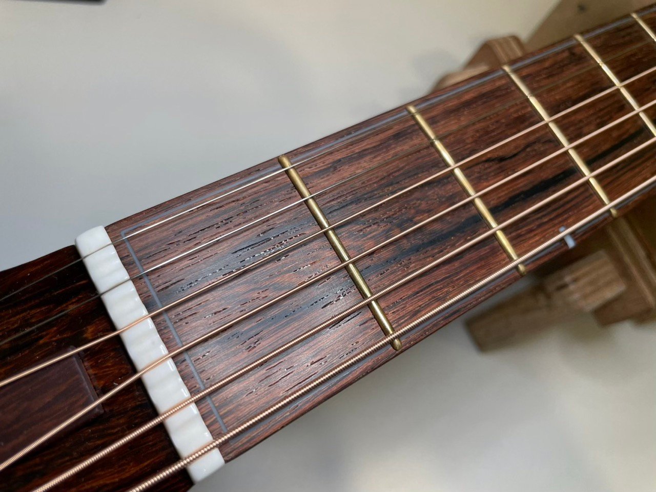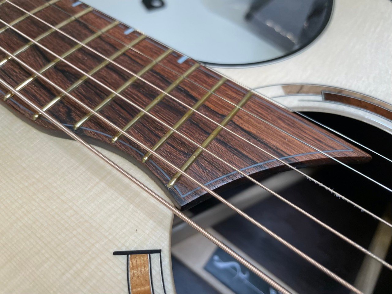 圓頭品絲常見,或者說必然的問題:每根fret的盡頭不一定切齊指板邊緣,這裡2, 3ft很明顯較短