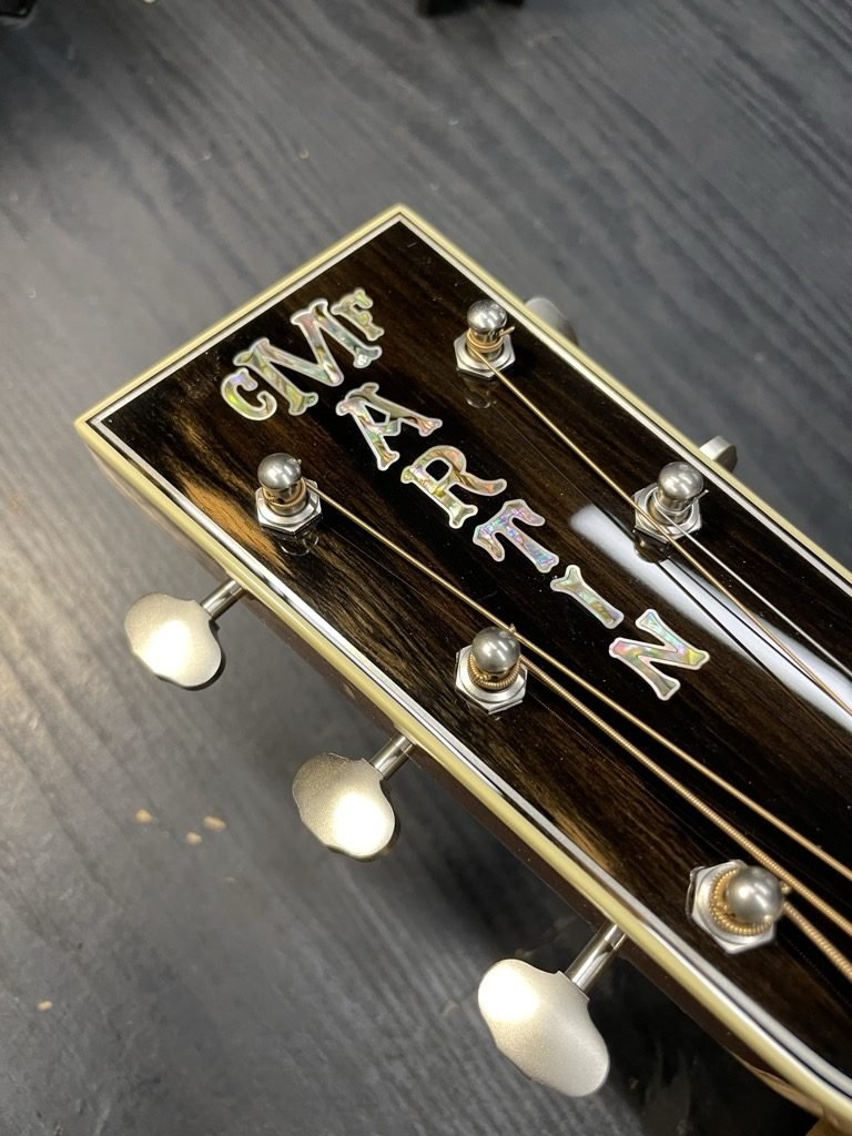 The 20th Anniversary “New Edition” OM-45JM features a highly recognizable visually striking gradient top. At first glance, its grayish-white hue might seem puzzling, but upon closer inspection, it subtly reveals a breathtaking powdery purple shimmer. As expected, its tone remains as outstanding as if it stepped right out of John Mayer’s music.