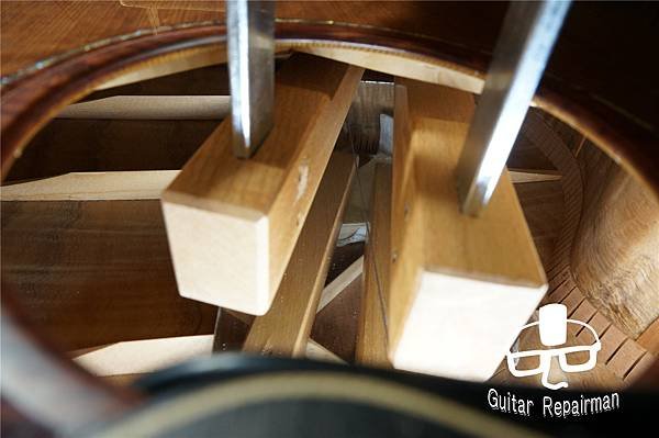 上弦測試二週後面板又膨回去接近原本的狀態了,故以木工夾以更強更集中的力道來加壓