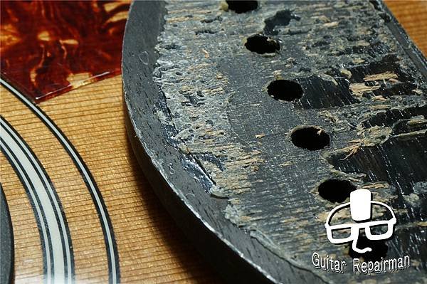 雖然開膠的風險能大幅降低,但代價也如Martin常見的琴橋靠響孔一側的漆面會被推擠,裂開或剝落
