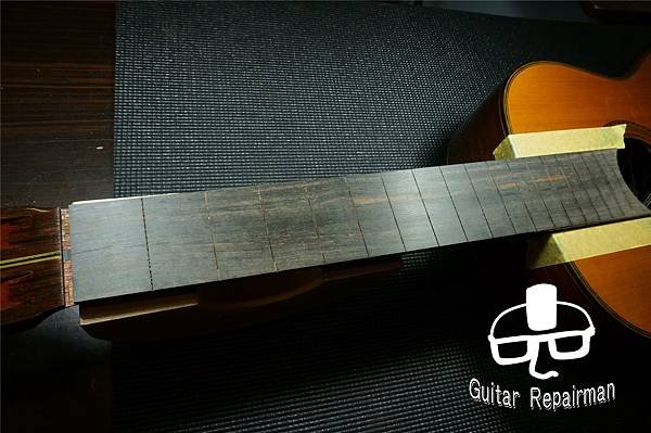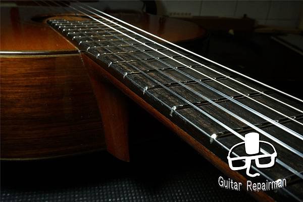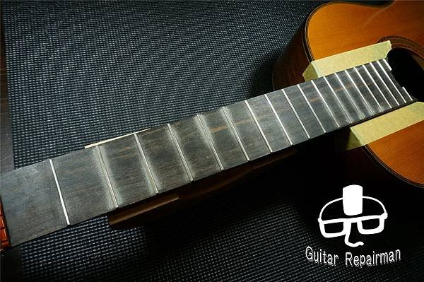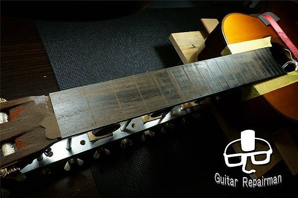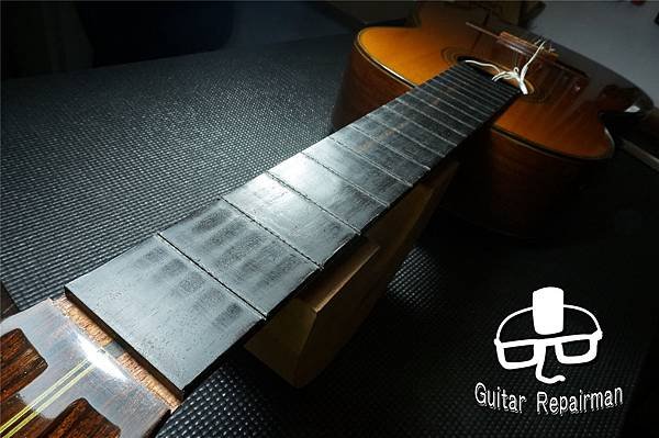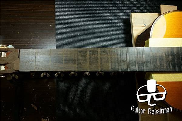 ◾️ 因fret長年磨損(或製作時整平過多),評估後採用大幅磨低低把位的指板