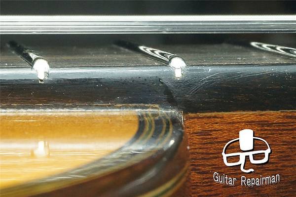 琴橋上有明顯的定位釘,在下枕槽底打鐵釘推測是某任技師在處理琴橋開膠時,為了藏定位釘而選擇埋在此處