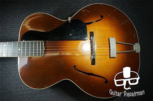 雖然面板實際上是有弧度的但目視不易辨認,而此案屬於”Arch top”家族,一般稱為爵士吉他
