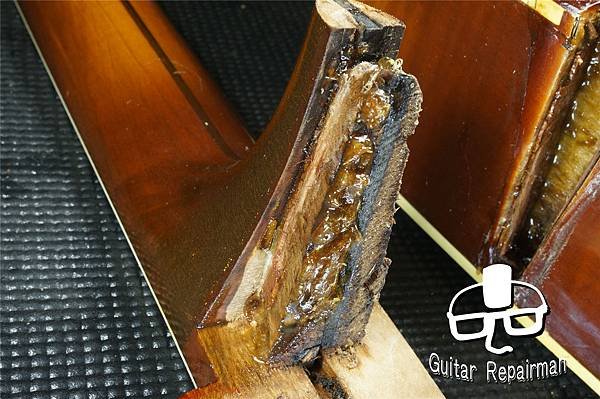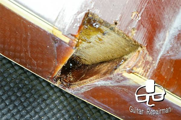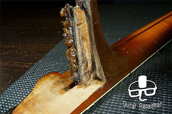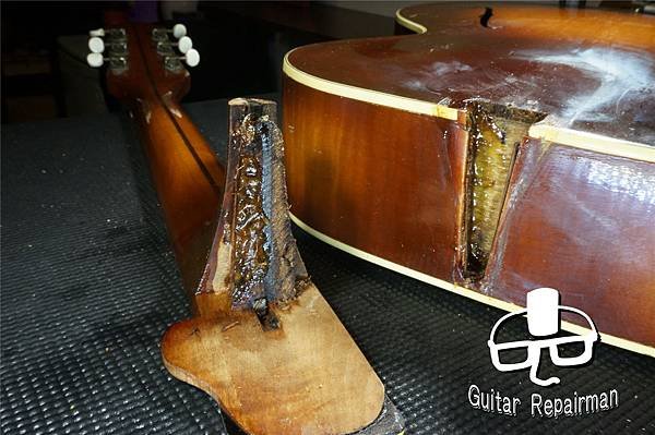 因膠水的劣解導致琴頸接合已不緊密,蒸氣無差別亂竄造成琴身漆面多處白化,留著最後再一併處理