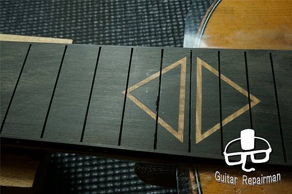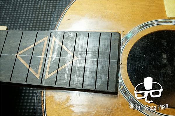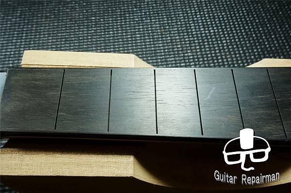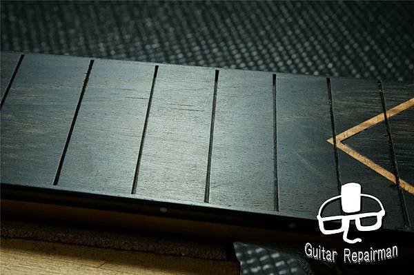為免影響琴頸厚度與剛性,故在不將鑲嵌磨穿的前提下盡可能以打磨14格以後區域來整平