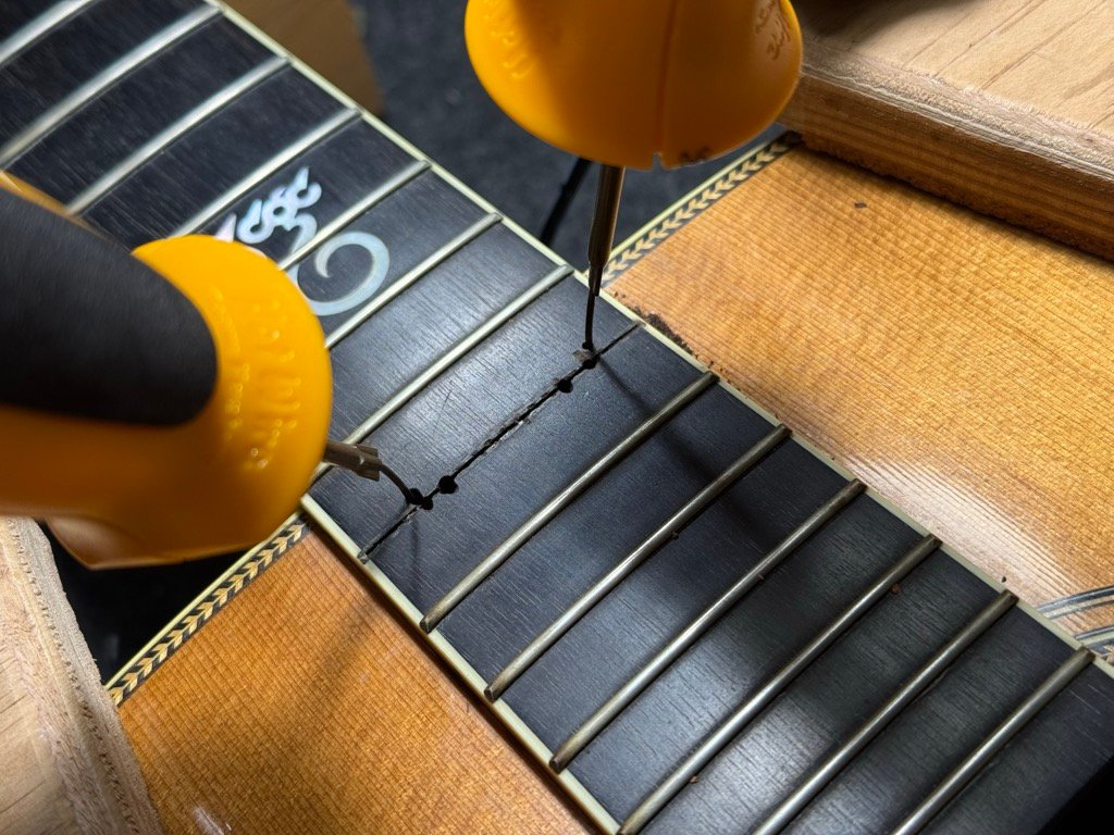 ▲ 最後調整接合的密合度,這個關乎到琴頸會不會再次開縫的關鍵步驟通常需要一兩個小時非常仔細的處理